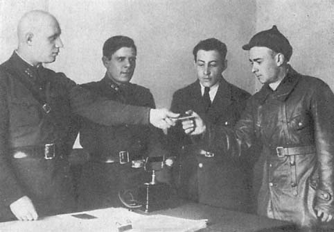 Б. А. Поздняков (первый справа) получает партийный билет.