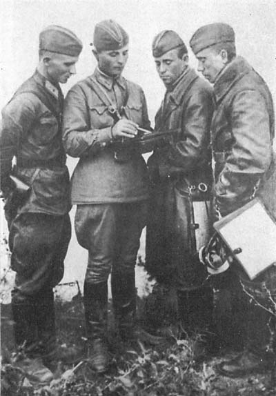 Задание получено. Через несколько минут они пойдут в бой. Справа налево: Г. Т. Кузнецов, И. В. Шкиндер, И. П. Вендичанский. Новоцарицыно. Октябрь 1941 г.
