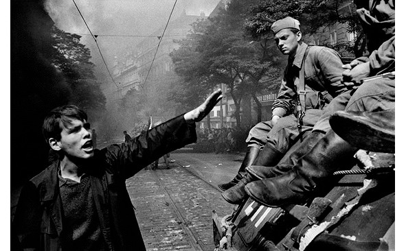 Молодой чех, горячо жестикулируя, обращается к сидящим на танке советским воинам. В ответ – глубоко человечный, понимающе-печальный взгляд такого же молодого русского… Фото Йозефа Коуделки.