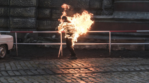 Мужчина кладёт на счетчик стрельбища сложенный лист бумаги с коротким наказом: «Я – за Человеческое лицо. Не переношу равнодушия». И подпись: Евгений Плоцек. А потом, отступив на пару шагов, зажигает спичку и становится живым факелом… Из пламени люди слышали крик: «Двадцать лет я был коммунистом!» и «За Палаха!»