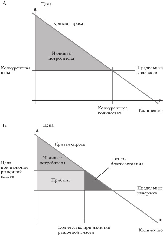 Теперь давайте расширим нашу аргументацию, чтобы показать взаимосвязь между рыночной властью и благосостоянием, начав с конкурентной отрасли. На рис. 2.1а цены нанесены на вертикальную ось, а количества – на горизонтальную.
