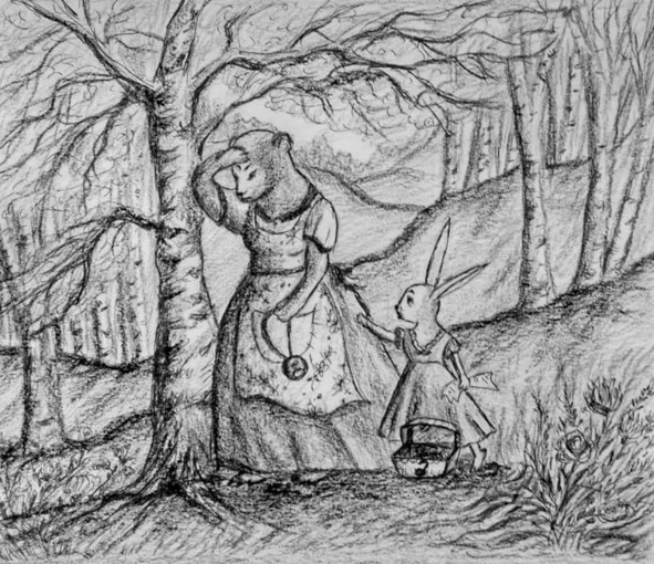 Зайчиха и медведица побежали к соседу Семёну-проныре. Марфа-кудесница делала широкие уверенные шаги, Василиса-краса вприпрыжку еле поспевала за ней на своих шустрых, белых лапках.