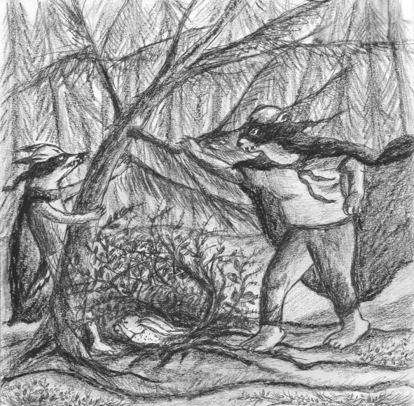 Заяц погрузился во мглу неприветливой чащи, осторожно продвигаясь по едва заметной узкой тропинке. Неожиданно он услышал какие-то подозрительные звуки и шорохи. Кузьма, и без того трусоватый и впечатлительный, не на шутку испугался и помчался напролом, не различая в темноте дороги. Он нёсся, обмирая от ужасного предчувствия. Вскоре он остановился возле колючего кустарника перевести дух и осмотреться. Вдруг заяц снова услышал треск веток слева, потом справа и быстро закрутил головой.