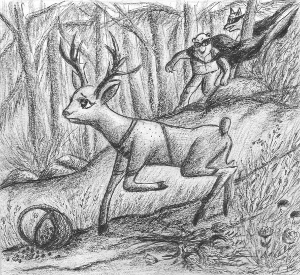 Вдруг он услышал, как кто-то бежит прямо на него, напролом, сшибая на своём пути развесистые еловые ветки. Феофан-звонкое копытце вздрогнул, горло сдавило от нехорошего предчувствия. Он уже отчётливо видел несколько громоздких фигур, прятавших своё обличие под чёрными масками и балахонами. Инстинкт самосохранения сработал мгновенно. Олень помчался что было сил! Сперва он ещё прижимал к себе цветы и корзину, но, когда преследователи оказались совсем близко, бросил всё и поскакал, как настоящий дикий зверь, на всех четырёх ногах, цокая копытами.