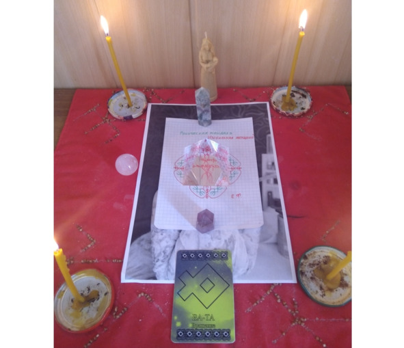 «Призываю к своему алтарю энергии моего рода, энергии моей Праматери и прошу помощи в проведении моей магической работы (можно назвать ритуал). Благодарю!»