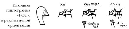 Шумерский знак KA изображает голову человека с подчеркнуто выпяченными губами, что обозначает «рот». Тот же знак может использоваться для записи слов DUG4 («говорить»), ZÚ («зуб»), KIR4 («нос»), INIM («слово»), причем как значение, так и произношение приходится определять из контекста. Внутрь этого знака KA может быть вставлен как в рамочку другой знак поменьше, который изменит как смысл, так и произношение внешнего знака. Таким именно образом при вставлении значка NINDA («еда») в знак KA образуется новый знак GU7 («есть»), а при вставлении значка A («вода») получается знак NAG («пить»):