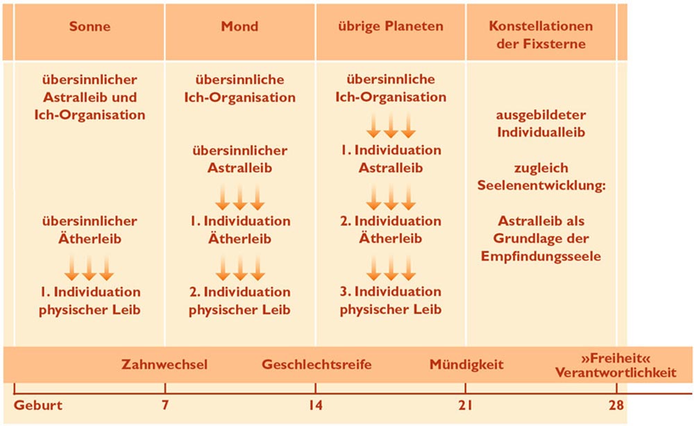 Hierfür beschreibt Rudolf Steiner eine Gesetzmäßigkeit und zeitliche Richtung, die überraschen kann. Das gestaltende Individual-Ich wendet sich zeitlich gesprochen zurück und durchläuft das 3. Jahrsiebt vom 21. zum 14. Lebensjahr, um aus dem bereits individualisierten Empfindungsleib die nun auch immer stärker individuelle Empfindungsseele herauszuarbeiten. Gleiches gilt für die Verstandes- oder Gemütsseele vom 14. bis zum 7. Lebensjahr, wo nun der individualisierte Lebensleib die Grundlage bildet für die individuelle Seelengestaltung. Schließlich arbeitet das Ich dann im 6. Lebensjahrsiebt an der Gestaltung der Bewusstseinsseele aus dem Stoff- oder physischen Leib heraus. Um das 42. Lebensjahr steht unser Ich dann erneut an dem Tor der Geburt als Schnittstelle oder auch Anfang der Geistentwicklung, die wir Alter nennen.