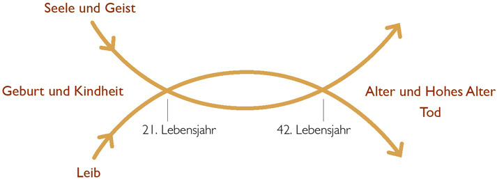 Aber auch für sich selbst hat der Mensch jetzt neue Verantwortung und Aufgaben. Bildet er doch in diesem dritten großen Lebensabschnitt seines Erdenganges an den persönlichen und individuellen Zukunftskräften, die er einmal über die Schwelle des Todes hinaus in ein Jenseits tragen wird, in welchem er geistig-seelisch ebenso real sein und leben wird wie zwischen Geburt und Tod leiblich-seelisch-geistig. In dem Bild zweier gegensinnig gerichteter Kurven der geistigen und leiblichen Existenz des Menschen kann der jeweilige Ab- und Aufschwung beider Entitäten sehr einfach veranschaulicht werden (siehe die Abbildung auf der folgenden Seite). Es gehört zu den wichtigsten Schnittstellen des menschlichen Lebens, ob sich um das 42. Lebensjahr herum die geistige Entwicklung von der nun absteigenden Linie der körperlichen Entwicklung abheben und mehr und mehr unabhängig von dieser verlaufen kann.