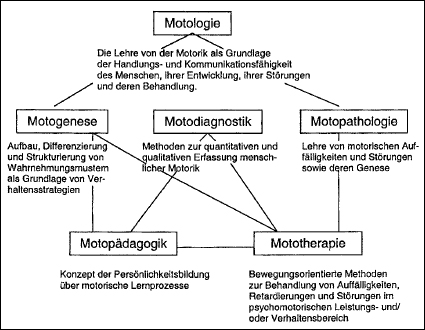 Das Fachgebiet der Motologie beschäftigt sich mit der „Lehre von der Motorik als Grundlage der Handlungs- und Kommunikationsfähigkeit des Menschen, ihrer Entwicklung, ihrer Störungen und deren Behandlung“ (Schilling 1981, 187). Es gliedert sich in die Teilgebiete der Motogenese, der Motodiagnostik und der Motopathologie sowie in der Anwendung von Fördermaßnahmen in Motopädagogik und Mototherapie. Abbildung 3 gibt einen Überblick über den Aufbau der Motologie im Entwurf der 1980er-Jahre (erste Fachsystematik).