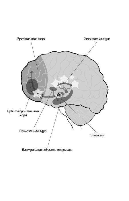 Разумеется, мозг крысы отличается от человеческого. Множество дальнейших исследований, основывающихся на открытии Олдса и Милнера, показали, что люди тоже обладают центром удовольствия – точнее, целой системой, отвечающей за удовольствие, и ее значение для человека трудно переоценить. На первый взгляд, нас могут смутить и запутать понятия «желание» и «удовлетворение» (последнее подразумевает получение награды, поощрение за что-либо). Однако, если внимательнее взглянуть на функционирование этой нейронной системы, мы придем к выводу, что именно в ней соединяются желание и удовлетворение, образуя тем самым одну из ключевых действующих сил нашего существования.