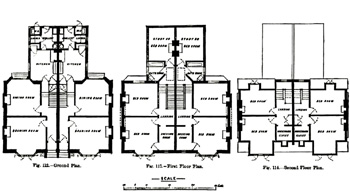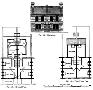 Plans for terraced houses for the lower middle classes, c. 1870s. Note there is no bathroom, and the lavatory is still reached from the outside. The kitchen is spacious, however, with a separate larder (opposite the lobby), and a scullery with a copper. These houses rented for about £30 a year.