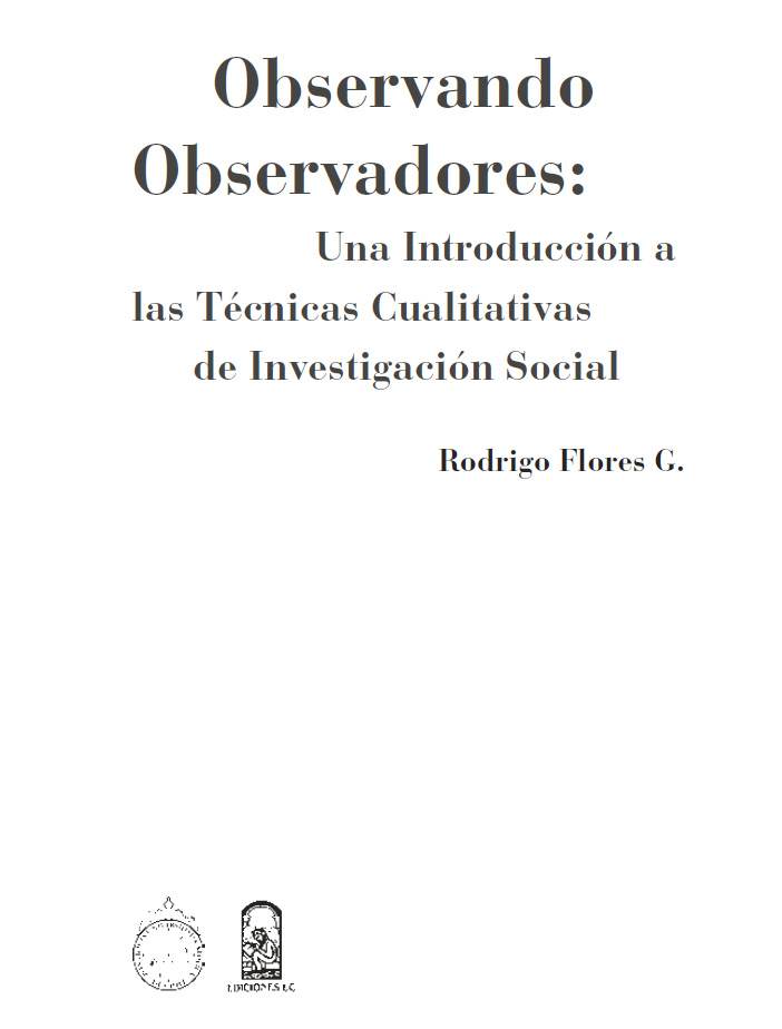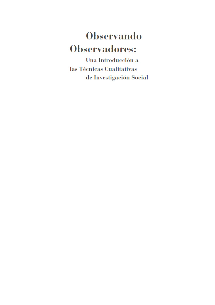 Observando observadores: una introducción a las técnicas cualitativas de investigación social, ha sido concebido como una herramienta de ayuda para estudiantes e investigadores iniciados en las técnicas de investigación social cualitativa. Su pretensión, en este caso, se circunscribe al ámbito de la divulgación de conocimientos ya instaurados y aceptados en forma mayoritaria en nuestras comunidades científicas sobre metodología de la investigación. Su intencionalidad es claramente práctica. Quienes hemos enseñado en la universidad asignaturas de metodología cualitativa, asesorado investigaciones de alumnos de pregrado y posgrado que se vuelven requisitos para sus procesos de titulación en diversas disciplinas de las ciencias sociales, hemos acogido la inquietud de nuestros estudiantes sobre múltiples aspectos. ¿Cómo se hace una investigación cualitativa? ¿Cómo se seleccionan las muestras? ¿Cuándo se debe aplicar una entrevista? ¿Qué pasos deben seguirse para la óptima realización de un grupo de discusión? ¿Cómo se analiza la información generada en la investigación? Todas estas preguntas son requerimientos concretos que la mayoría de los libros sobre metodología cualitativa no responden. Los alumnos, aunque no sólo ellos, requieren el desarrollo de competencias concretas sobre contenidos, pasos, directrices, normas y consejos en la aplicación de técnicas cualitativas. El propósito de este texto es responder a tales requerimientos.