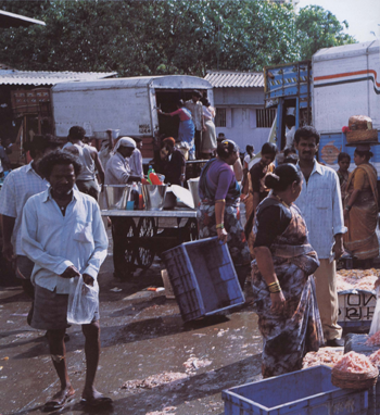 British buildings dominate the area. The Ice House was built to store ice imported from Boston until it was used to cool the gin and tonics of the British residents. The Madras Club was built as a place where the British elite could drink the G & Ts. The chief reminder of colonial days, however, is the High Court, the largest court of law building in the world outside London. To the south, 20 hectares of narrow lanes form the city’s largest market, Kothawal Chavadi, which includes a colourful fruit and flower section. On the outskirts of the city is Asia’s biggest film studio complex, just beyond the jaws of a fake shark which guards MGR Film City. On this enormous site, funded by the state government, are 36 sets standing ready for use. Tourists are sometimes invited to be extras, especially in Raj-era films.