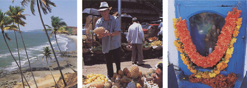 Below left to right One of the many beautiful beaches in Goa. Panjim market. Marigolds in the Latin quarter.