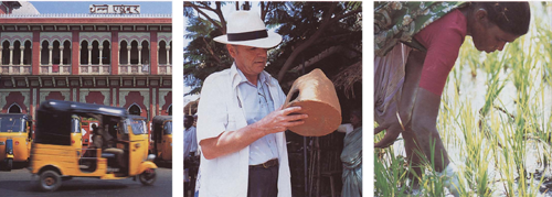 Above left to right Taxis Madras-style. A little wood burner. In the paddy fields.