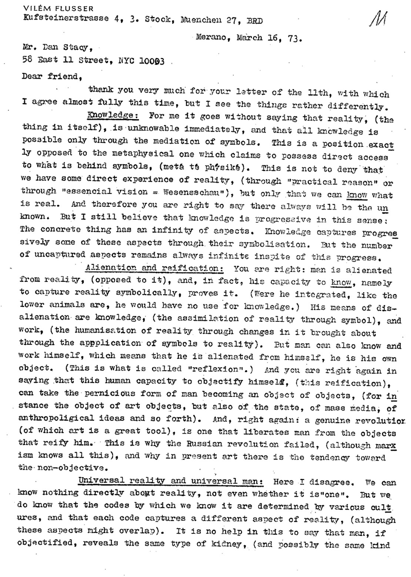 Переписка Флюссера с нью-йоркским художником Дэном Стейси продолжалась более десяти лет [6]. Стейси обратился к нему первым в 1973 году, будучи под впечатлением от опубликованной в «Основных течениях…» статьи. Обмен письмами перешел в тесное интеллектуальное общение. В приведенном здесь письме Флюссер, прежде всего применительно к визуальным искусствам, говорит о необходимости критического взаимодействия с «информированными объектами». В расширенном понимании слова «информация», как оно встречается у Флюссера, любая обработанная или произведенная человеком вещь, от каменного рубила до квантового компьютера, представляет собой «информированный объект» – «как сообщает нам само слово „информация“, речь о „формах“, вложенных „в“ вещи» [7]. В качестве критического подхода к подобным вещам и – более абстрактно – к положению вещей в целом Флюссер в своем письме к Стейси приводит позицию, которую мы можем назвать феноменологической и на которую он делает особый упор: «…у конкретной вещи бесконечное множество аспектов». Именно с помощью феноменологического подхода Флюссер подвергает анализу вещи и их взаимосвязи, и именно его он отмечает в различных своих трудах как ту эпистемологическую стратегию, которой подчинен ход всего его мышления. Как неустанно показывает Флюссер, именно феноменология позволяет ему занимать какое угодно число позиций по отношению к осмысливаемой вещи или положению вещей.