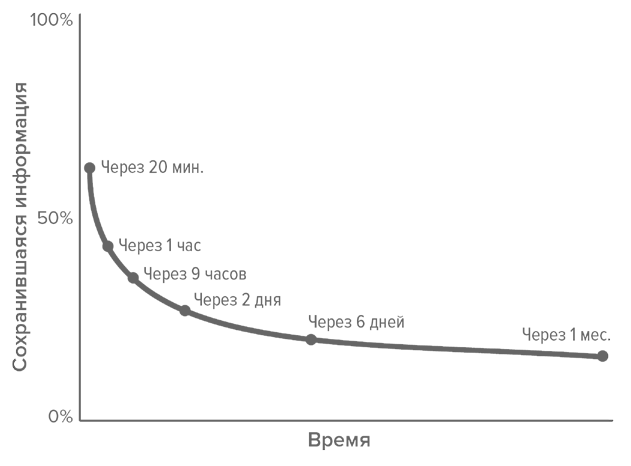 Сколько бы раз он ни проводил этот эксперимент, результаты выходили одни и те же: за первый час после заучивания набора бессмысленных звуков более половины из них успевали забыться. Через день исчезали из памяти еще 10 %. Месяц спустя – еще 14 %. Затем оставшиеся воспоминания более-менее стабилизировались, отложившись в долгосрочной памяти, и скорость забывания замедлялась.