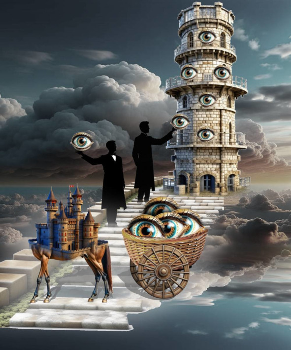 …башня спешит, башня торопится, башня спотыкается на ходу, чуть не падает, вот черт, сейчас растянулась бы во весь рост, хороша бы была башня, хороша… Башня хочет посмотреть на часы, которые на ней самой, не может, как башня посмотрит на саму себя? Наконец, догадывается взять зеркало, глянуть на часы, – ничего не понимает, часы-то отраженные, башня и так по стрелкам плохо знает, как время понимать, а тут еще и в зеркале…