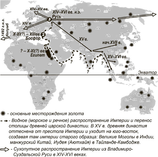 Рис. 1. Общая схема нашей реконструкции истории. Показан предположительный путь распространения белого человека: из экваториальной области Евразии вдоль берегов южных морей на запад, затем в Красное море и, наконец, в долину Нила, где возник очаг цивилизации в виде первого на Земле земледельческого государства. Здесь люди научились делать медные орудия, а в качестве денег было назначено золото. По морским путям были освоены берега Средиземного и Черного морей и впадающих в них крупных рек – Дуная, Днепра, Дона, а также Волги (с переволокой из Дона). С открытием железа столица Империи перемещается на Босфор, ближе к железным рудникам и приблизительно в центр освоенного тогда мира. После эпохи Христа XII века, в ходе последовавшей за ней смуты XIII века, Древняя Империя со столицей на Босфоре разваливается, а затем возрождается со столицей уже на Руси. В XIV–XVI веках Великая Русская Средневековая Империя осваивает внутренние просторы Евразии, а также Америку. Древняя прародина – Египет – служит царским кладбищем до XV века, умерших царей возят хоронить на родину предков в забальзамированном виде. В XV веке старая царская династия, оттесненная от престола Империи, уходит на юго-восток – в Индию, Китай, Тайланд-Камбоджу (Иудею), Малазию, о. Яву, создавая там государства-империи старого образца. Впоследствии, в XVI–XX веках, все они были уничтожены. Великая Русская Средневековая Империя развалилась из-за внутренних смут в начале XVII века.