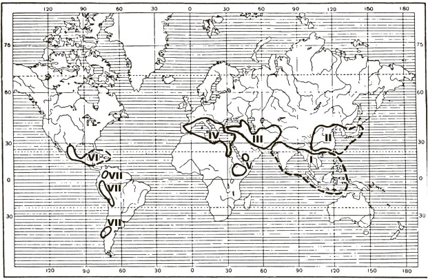 Рис. 3. Центры происхождения культурных растений по Н. И. Вавилову. (I) родина 33 % современных культурных растений, в том числе риса, сахарного тростника, многих овощей и плодов; (II) родина 20 % культур – сои, различных видов проса, многих овощей и плодов; (III) родина 14 % культур – ржи, некоторых видов пшеницы, бобовых и почти всех европейских плодов, включая виноград; (IV) родина 11 % культур – маслины, некоторых овощей и кормовых культур; (V) родина 4 % культур – твердых сортов пшеницы, ячменя, люцерны, некоторых зернобобовых, кофейного дерева; (VI) родина 9 % культур – кукурузы, хлопка, некоторых видов фасоли, перца; (VII) родина картофеля и др.