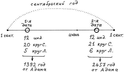 Сегодня, пересчитывая указанные даты на «эру от Адама» без учета разницы в моменте перескока, мы получим следующий «результат». Первая дата: 1392 год от Адама, вторая дата: 2457 год от Адама. Мы видим, что разница между ними составляет более тысячи лет, см. рис. 1.36. Хотя изначально обе даты находились внутри одного и того же сентябрьского года. Ясно видно, к каким огромным ошибкам могла приводить такая «забывчивость» хронистов. Естественно, указанный нами пример чисто условен и призван лишь показать величину возникающих ошибок.