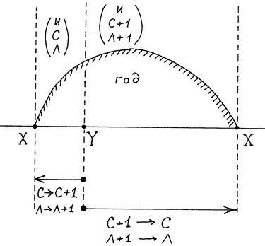 Чтобы избежать ошибки, нам нужно знать моменты X и Y. Зная их, мы можем привести сведения первоисточника к современному виду, пригодному для использования современных таблиц пересчета. А именно, нужно либо уменьшить на единицу взятые из документа значения круга Солнцу и круга Луне после точки Y, что соответствует перенесению их «перескока» на начало следующего индиктового года. Либо наоборот, увеличить их на единицу в промежутке от X до Y, что отвечает сдвигу точки их «перескока» на начало текущего индиктового года. Два указанных способа приводят, естественно, к разным ответам. И только один из них будет правильным. Если мы не знаем, как именно следует поступать, то необходимо рассмотреть оба варианта, см. рис. 1.38.