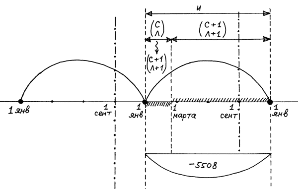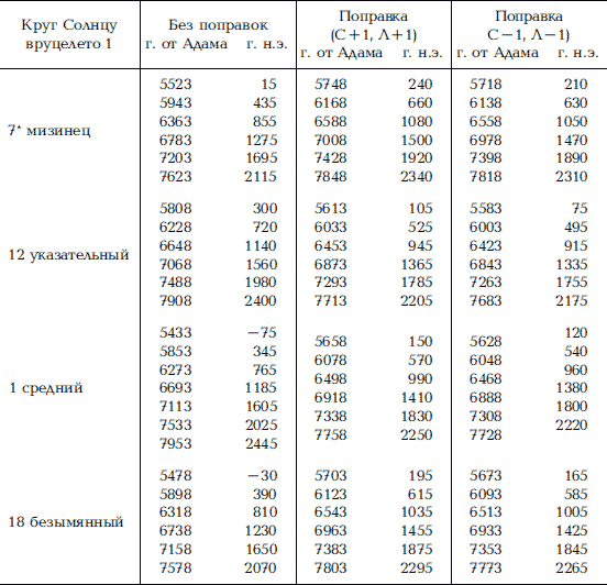б) Для дат с 1 марта по 31 декабря подправлять круги Солнцу и Луны не нужно. Но при пересчете на года н. э. так же, как и в предыдущем случае, всегда вычитается 5508. Дело в том, что в промежуточном вычислении сентябрьского года от Адама мы при указанном способе совершим ошибку для месяцев с сентября по декабрь, уменьшив результат на единицу. Это компенсируется тем, что мы будем вычитать для указанных месяцев по-прежнему 5508, а не 5509, как следовало бы при пересчете с византийской сентябрьской эры от Адама на года н. э. для промежутка с сентября по декабрь.