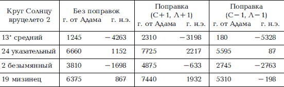 Рис. 1.38. Два возможных варианта поправки, которую необходимо ввести в круги Солнцу и Луне в первоисточнике, чтобы привести начало всех трех циклов к одной точке отсчета. Последнее необходимо, чтобы можно было воспользоваться современными таблицами для расшифровки даты, названной в первоисточнике.