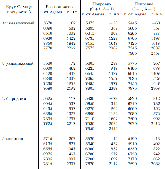 С учетом того, что первоначально в дате Рождества не был указан перст руки Дамаскиновой и что потом его «восстановили», но неправильно, мы имеем четыре варианта для круга Солнцу. Указанный в Палее круг Солнцу 13 отвечает цифре 2 на среднем персте, см. рис. 1.33. Тому же вруцелету 2 на других перстах соответствуют такие круги Солнцу: на указательном – 24, на безымянном – 2, на мизинце – 19. Все варианты надо перебрать. Для каждого варианта мы проводили три расчета: без поправок в кругах Солнцу и Луне, затем с поправкой на +1 и, наконец, с поправкой на – 1. Таким образом, мы учли все возможности, вытекающие из двух перечисленных возможных ошибок.