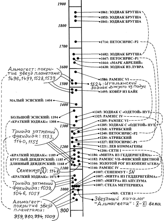 Рис. 0.5. Сводная таблица основных полученных нами астрономических датировок, в том числе старинных зодиаков с гороскопами. Если в каких-то случаях возникало больше одного астрономического решения, то эти различные варианты соединены пунктиром