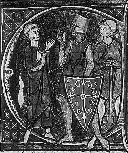 Рис. 1.6. Инициал во франко-фламандской рукописи конца якобы XIII века с изображением трех западно-европейских сословий (каст): «тех, кто молится, тех, кто сражается, и тех, кто работает» [160], с. 94. Эти сословия очевидно соответствуют известным «древне»-индийским кастам.