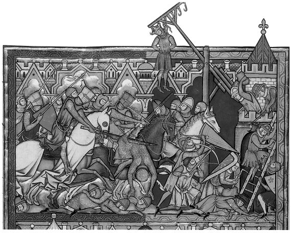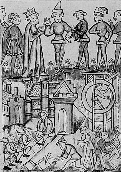 Рис. 1.11. Миниатюра из французской Библии якобы около 1250 года. Эпизод завоевания израильтянами земли обетованной (Книга Иисуса Навина). Показано взятие города Гая и казнь царя Гайского. Согласно нашей реконструкции, здесь изображена на самом деле битва времен османско-атаманского завоевания Западной Европы и Средиземноморья войсками Руси-Орды (то есть библейского Израиля) и Османии-Атамании (то есть библейской Иудеи) в XV–XVI веках н.э. Взято из [160], с. 112, илл. 2.