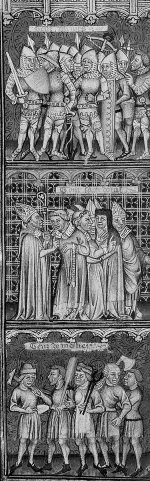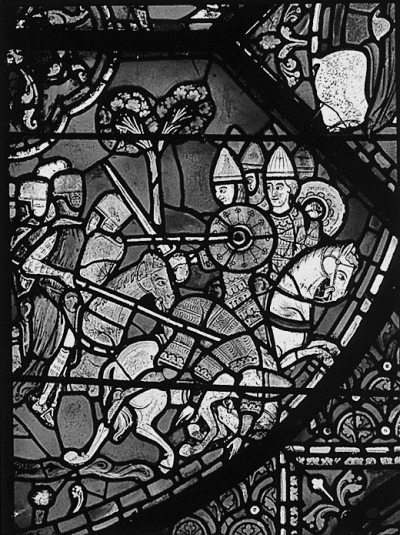 Рис. 1.13. Карл Великий сражается с сарацинами. «Окно Карла Великого». Фрагмент витража. Шартрский собор. Франция, якобы XIII век. Взято из [160], с. 242, илл. 3. Согласно нашим исследованиям, Карл Великий и библейский Иисус Навин являются фантомными отражениями одного и того же средневекового правителя эпохи XIV–XVI веков. См. подробности в книге «Библейская Русь», ХРОН6.