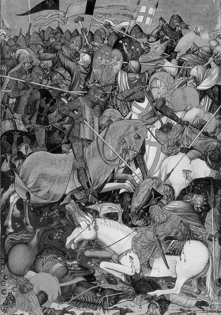 Рис. 1.12. «Войско христиан под предводительством короля Арагона Хайме I Завоевателя наносит поражение мусульманам в битве при Пуиге… Воин с нимбом – небесный заступник Испании св. Иаков» [160], с. 242, илл. 1. Испания, якобы 1420 год. Историки относят данную битву к 1237 году. Однако, скорее всего, перед нами – одно из жестоких сражений эпохи османско-атаманского завоевания земли обетованной казацкими войсками Иисуса Навина.