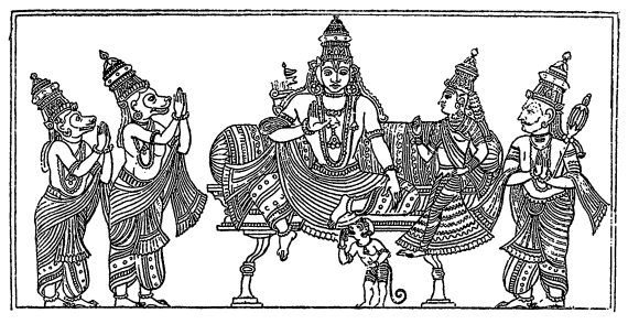 У Дашаратхи, царя Авадха, было много жен, но он был бездетен. Наконец, в старости, у него от разных жен рождаются четыре сына. Старший сын РАМА, по имени которого и называется Рамаяна, превосходит своими добродетелями всех других. Царь Дашаратха назначает его своим наследником и собирается передать ему царство. Однако при дворе начались интриги. Из-за них Рама вынужден уйти в изгнание в дикие леса, где проводит четырнадцать лет. Вместе с ним уходят его жена Сита и брат Лакшман. Могучий царь демонов (ракшасов) по имени Раван похищает Ситу в лесу. В поисках Ситы Рама блуждает по лесам и оказывается в стране обезьян. Он заключает союз с царем обезьян Сугривом и выступает в поход на город Ланку, столицу «плохого» Равана. Рама побеждает Равана, убивает его, возвращает Ситу и вместе с ней и Лакшманом возвращается в Авадх, где наконец становится царем [117], с. 19. На рис. 1.15 приведено старинное индийское изображение, на котором цари и принцы обезьян поклоняются Раме.