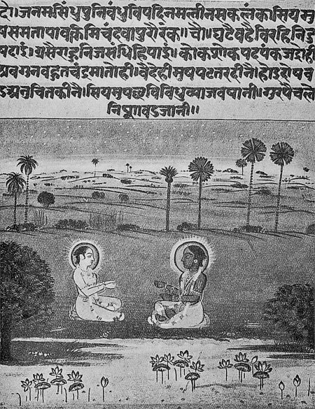 Этот несложный сюжет был в дальнейшем сильно развит. Он обрастает многочисленными деталями, вставляются дополнительные легенды и сказания, поэма нагружается развернутыми философскими, религиозными и моральными рассуждениями. В итоге ее объем существенно вырастает. В изложении Тулси Даса якобы XVI века (в современном широкоформатном издании [117]) Рамаяна занимает примерно девятьсот страниц достаточно плотно набранного текста. «Поэма поражает огромным количеством персонажей» [117], с. 30. Уже из всего этого видно, что труд Тулси Даса является, скорее всего, обобщающим, завершающим. Он подводит итог длительного развития поэмы за период XIV–XVI веков и окончательно сложился, по-видимому, не ранее XVII–XVIII веков. Или даже в XIX веке. На рис. 1.16 приведена миниатюра из рукописи «Рамаяны» Тулси Даса якобы XVI века, где изображены Рама и Лакшман. Обратите внимание на нимбы вокруг голов. Они как у христианских святых.