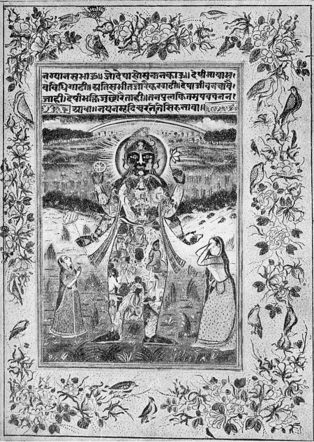 Рис. 1.18. <<Рама в образе Вират. Страница из рукописи «Рамаяны» Тулси Даса. Индийский музей искусств. Бенарес>> [117], вклейка между с. 288–289. Вокруг головы Рамы мы видим светящийся нимб, как у христианских святых. Вряд ли эта прекрасно выполненная миниатюра дошла до нас из далекого XVI века. Скорее всего – это XVIII или даже XIX век.