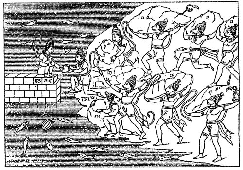 Рис. 1.19. Старинное индийское изображение: «Хануман, царь обезьян, строит мост между континентом и островом Цейлон». Взято из [159], с. 737, илл. 818.