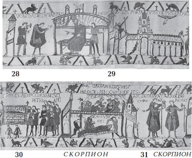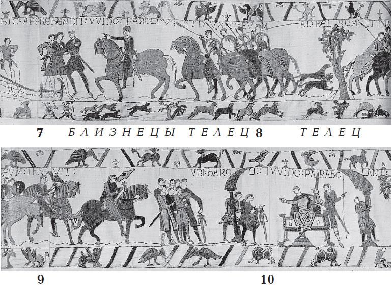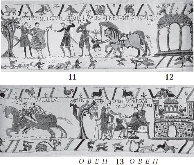 Воспользуемся подробным описанием ковра из Байе в фундаментальном издании [138], с. 10–12. В нем дано полное цветное, а также черно-белое воспроизведение ковра, его научное описание и комментарии. Издатель и комментатор [138] – сотрудник Британского Музея Давид М. Вильсон.