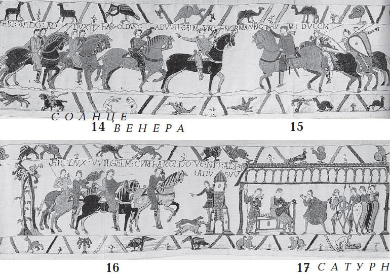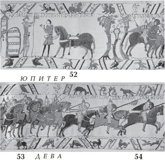Мы полностью воспроизводим ковер из Байе на рис. 1.1 – рис. 1.22. В издании [138] ковер разделен на 73 листа, каждому из которых отведен полный разворот книги. Номера листов, заимствованные из [138], мы проставили на приводимых здесь рисунках. Расположенные вверху и внизу надписи на рисунках сделаны нами. Их смысл станет понятен из дальнейшего. Оказывается, на ковре изображен среди прочего астрономический гороскоп, который указывает, вероятно, на дату изготовления ковра. В любом случае, ясно, что дата изготовления ковра могла быть только ПОЗЖЕ даты, записанной на нем с помощью гороскопа.