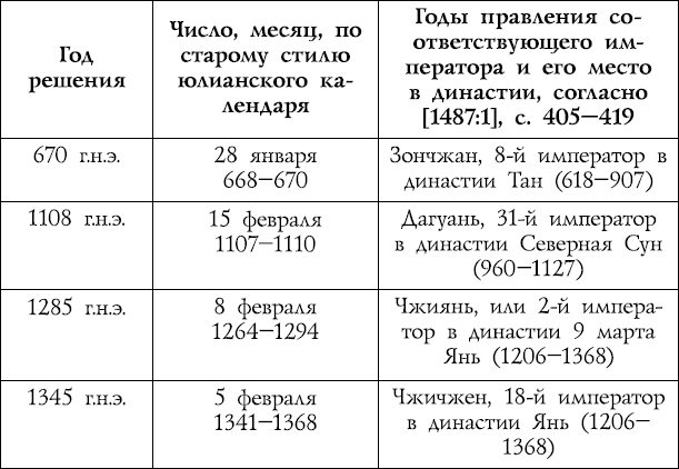 Приведем теперь список всех решений гороскопа КТ, приходящихся одновременно на день новолуния и на весну. Для каждого решения будем отмечать, на правление какого по порядку императора в той или иной китайской династии это решение приходится. В качестве даты решения приводится день появления на небе серпа молодого месяца, поскольку именно этот день чаще всего считался в старину первым днем лунного месяца. От астрономического новолуния он отличается примерно на 2 суток.