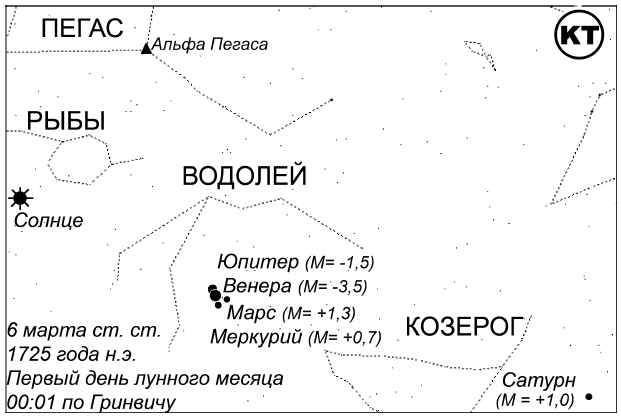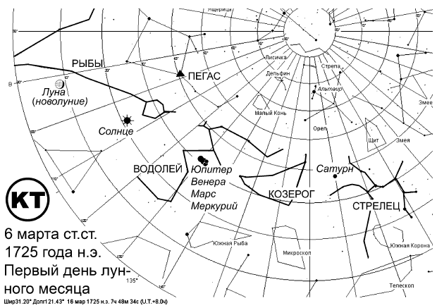 И, наконец, полученное нами решение ИДЕАЛЬНО удовлетворяет ВООБЩЕ ВСЕМ условиям гороскопа. В том числе и тем, которые мы первоначально даже и не пытались учесть, поскольку они казались на первый взгляд мало надежными и даже противоречивыми. А именно, согласно изложению Морозова, схождение планет произошло в ПЕРВЫЙ ДЕНЬ ПЕРВОГО МЕСЯЦА. Согласно же описанию из [1487:1], оно произошло В ШЕСТОЙ ДЕНЬ МЕСЯЦА, см. выше. Казалось бы, между этими цифрами есть противоречие. Первый день месяца или шестой? Но как выясняется, никакого противоречия тут нет. Дело в том, что в 1725 году планеты сошлись в окрестности Водолея-Козерога 6 марта по старому стилю в день новолуния. Таким образом, этот день являлся ОДНОВРЕМЕННО: