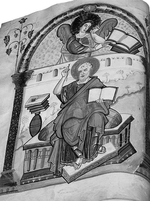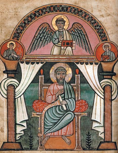 Рис. 1.1. Старинный «портрет» евангелиста Матфея. Якобы середина VIII века. Codex Aureus. Любопытно, что Матфей изображен сидящим на троне. Взято из [1075:1], с. 74.