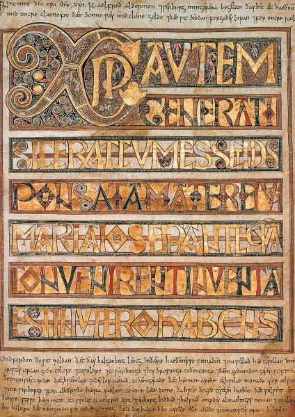 Рис. 1.2. Первый лист старинной копии Евангелия от Матфея. Якобы VIII век. Codex Aureus. Взято из [1075:1], с. 75.