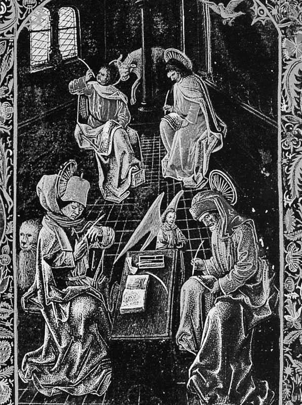 Рис. 1.6. Четыре евангелиста. На переднем плане: Матфей с ангелом – справа, Марк со львом – слева. Во втором ряду: Лука с тельцом – слева, Иоанн с орлом – справа. Миниатюра из «Das Schwarze Gebetbuch». Взято из [1075:1], с. 362.