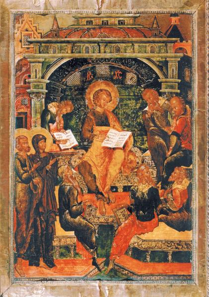 Рис. 1.35. Христос беседует с книжниками. «Преполоновение». Русская икона XVII века. Сольвычегодский историко-архитектурный музей. Взято из [745:1], с. 216, икона 414.