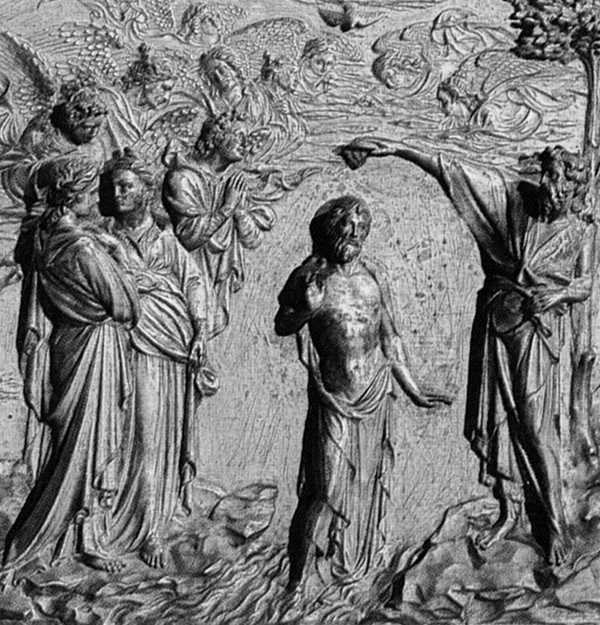 Рис. 1.45. «Крещение Христа». Иоанн Креститель крестит Иисуса в Иордане. Гиберти. Якобы 1417–1425 годы. Сиена, Баптистерий. Взято из [91:1], с. 55.