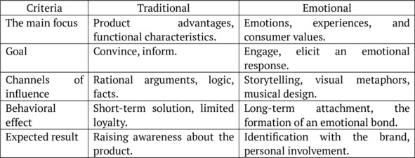 The contrast between traditional and emotional marketing clearly illustrates how the focus in advertising strategies has shifted – from logic and facts to feelings and personal engagement. Table 1 presents a comparative overview of the main differences between these approaches.