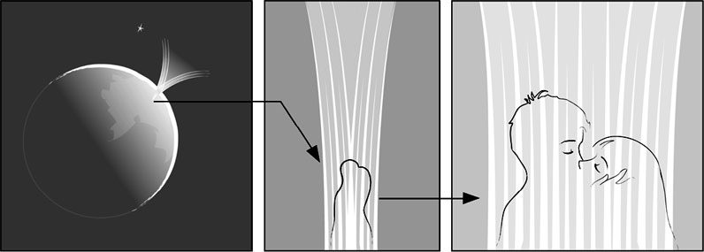Таким образом, кроме взаимодействия родовых каналов будущих родителей мы имеем ещё один тип взаимодействий: взаимодействие тонких планетарных и космических структур с взаимодействующими родовыми каналами. (5)
