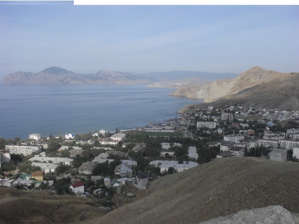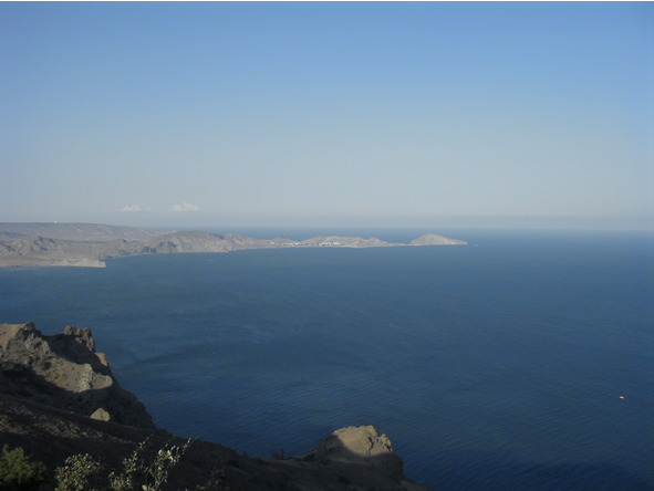 На противоположной стороне западного залива возвышается громада Карадага, а еще дальше к западу прекрасно видна огромная плоская гора, выдвинувшаяся далеко в море – это еще одно чудо Крыма – Меганом.